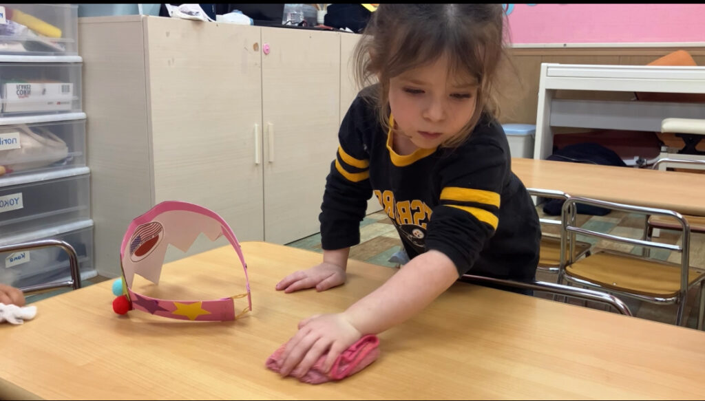 Even our youngest learners—children as young as 2–3 years old—take part in cleaning time. Putting toys away, wiping tables, and helping to tidy the room are all done in a hands-on, age-appropriate way. What’s truly special is how seriously they take this responsibility and the pride they feel when their space is clean and organized.